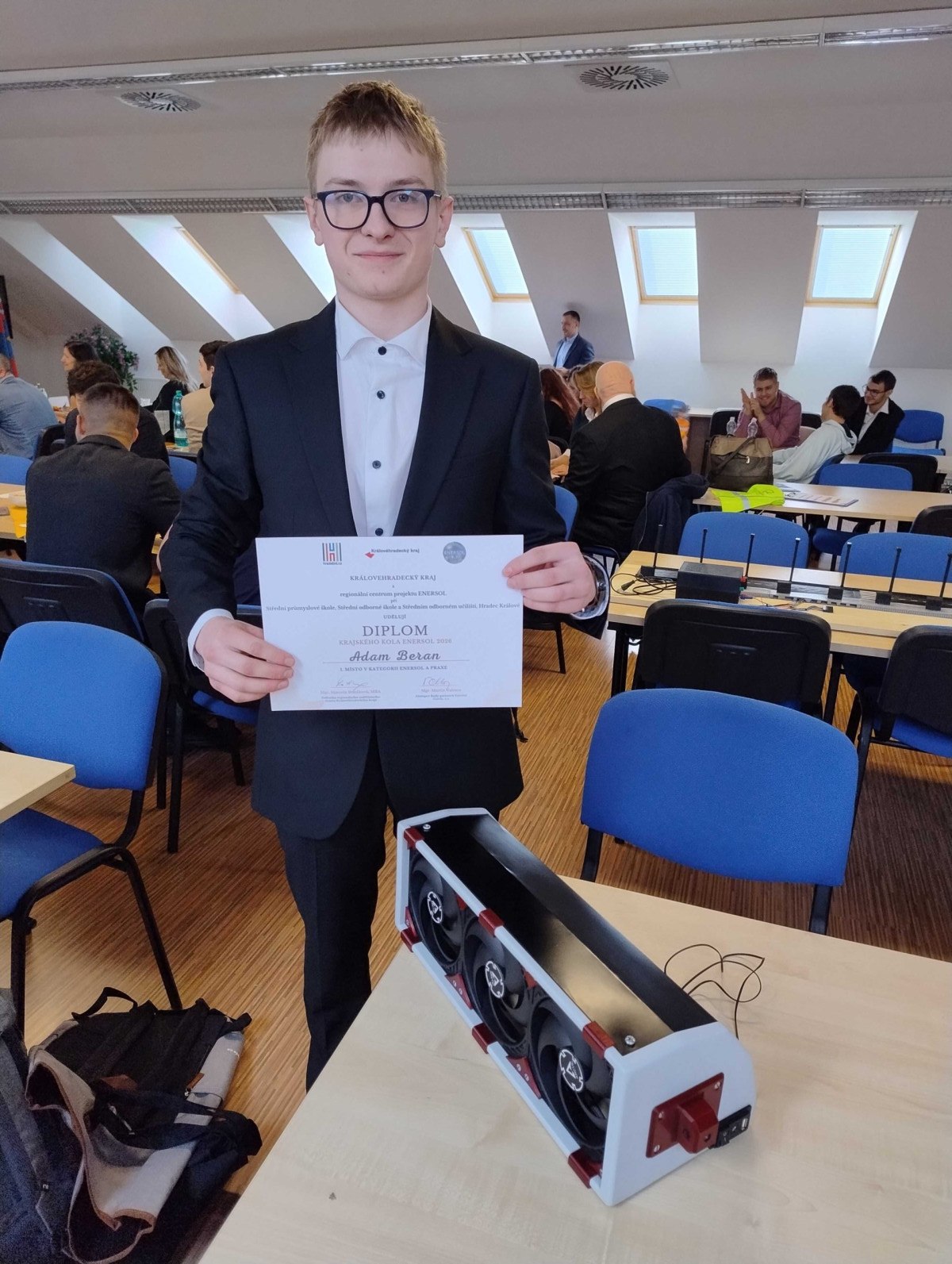 Adam Beran z EA4 zazářil v kategorii Enersol a praxe, kde mezi sedmi týmy z celého kraje vybojoval 1. místo. Odbornou komisi zaujal projektem Chlazení fotovoltaického měniče. Nezůstalo však jen u teorie – Adam představil vlastní chladicí systém i praktickou ukázku jeho funkčnosti. Právě spojení technického přemýšlení, precizního zpracování a reálného využití rozhodlo o jeho vítězství.