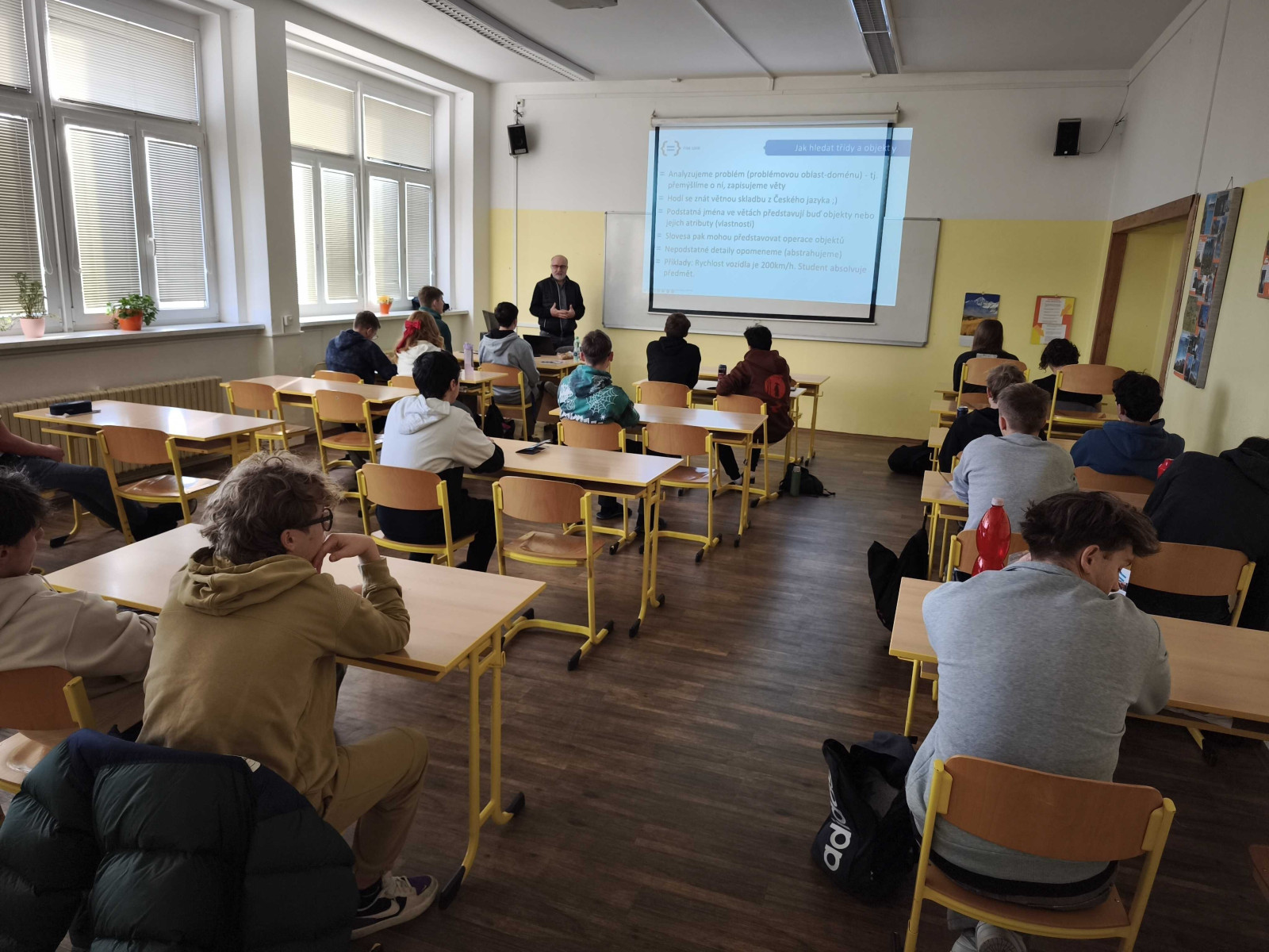 Žáci se během přednášky dozvěděli základní principy tvorby objektově orientovaných aplikací i přehled aktuálních trendů v oblasti vývoje softwaru. Dále byli seznámeni s vývojem oblíbenosti programovacích jazyků a se samotným procesem vývoje softwaru. Při přednášce byla zmíněna také pokročilejší témata programování, například návrhové vzory. V neposlední řadě se posluchači dozvěděli informace o webových aplikacích. Vše pan docent demonstroval také prakticky prostřednictvím ukázek v různých programovacích jazycích, jako jsou Java, JavaScript a Python.