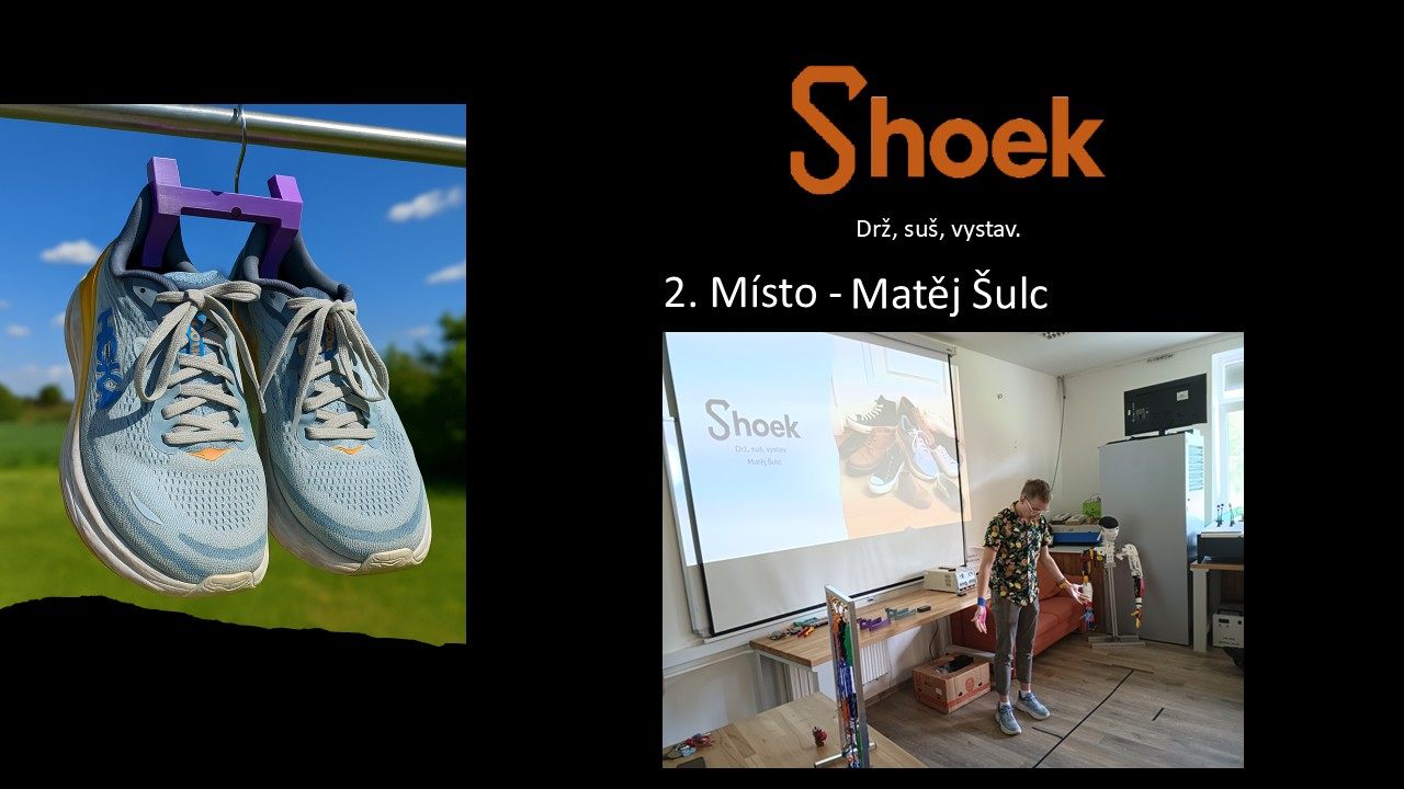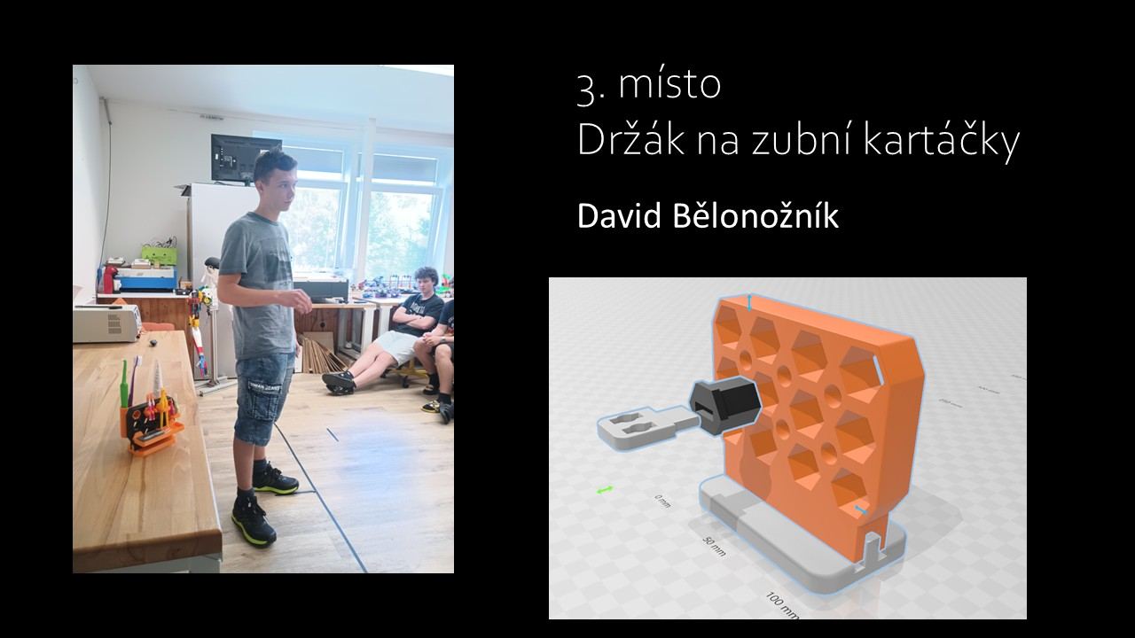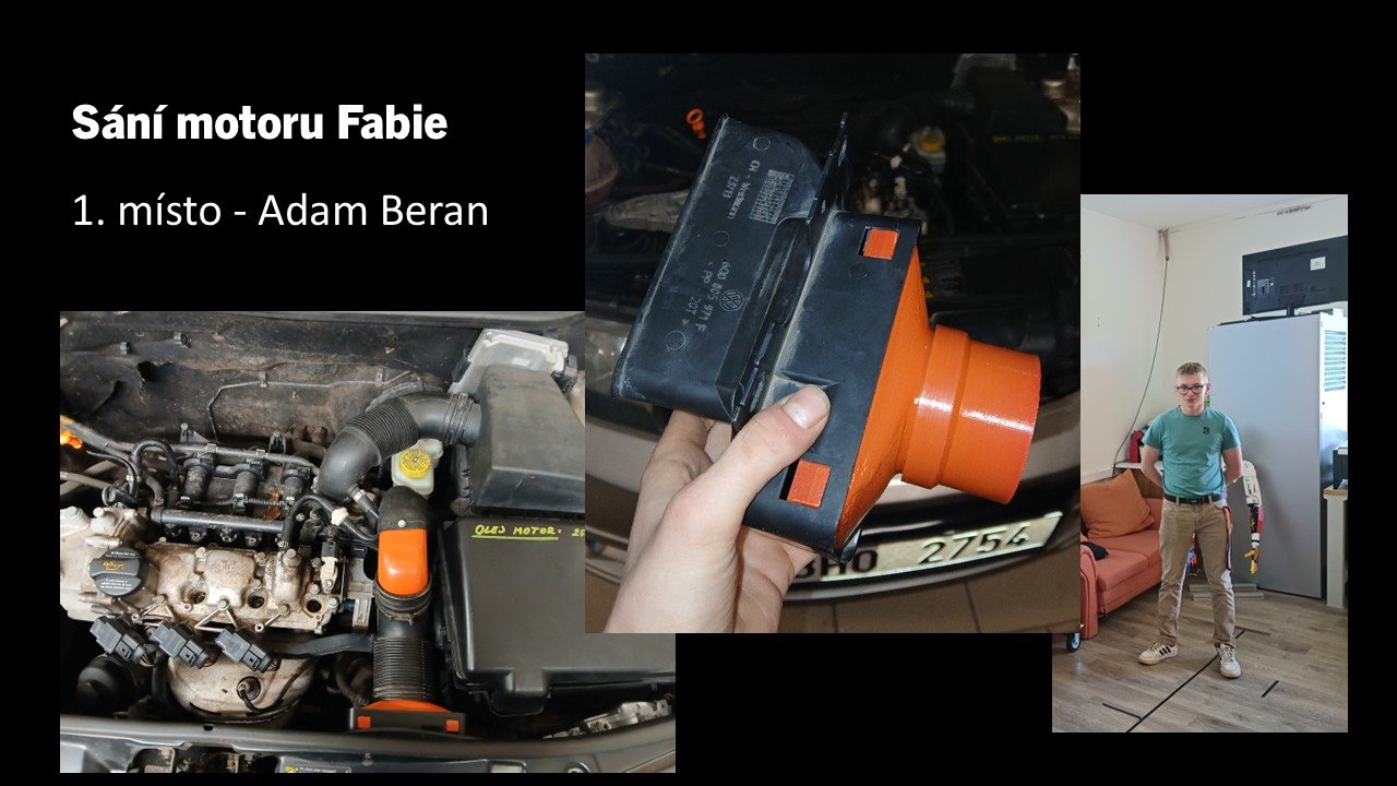 Na 3. místě se s modulárním držákem na kartáčky umístil David Bělonožník. 2. místo získal za projekt držáku na boty Shoek Matěj Šulc a 1. místo obsadil s nápadem vylepšeného sání pro motory Škoda Fabia Adam Bělonožník. Všichni tři studenti získali poukazy v celkové hodnotě 5tis. Kč. Gratulujeme a děkujeme za skvělé nápady!
