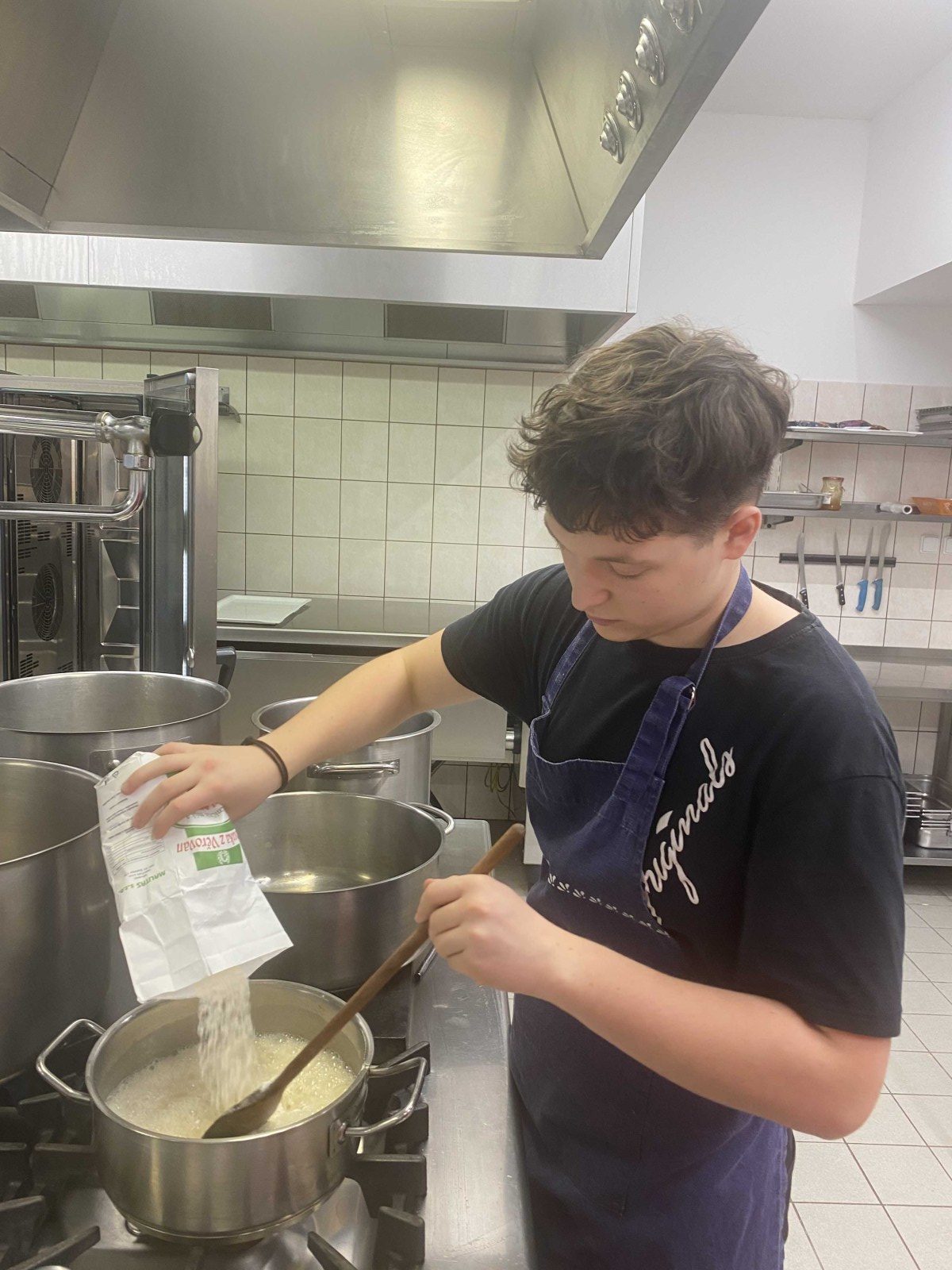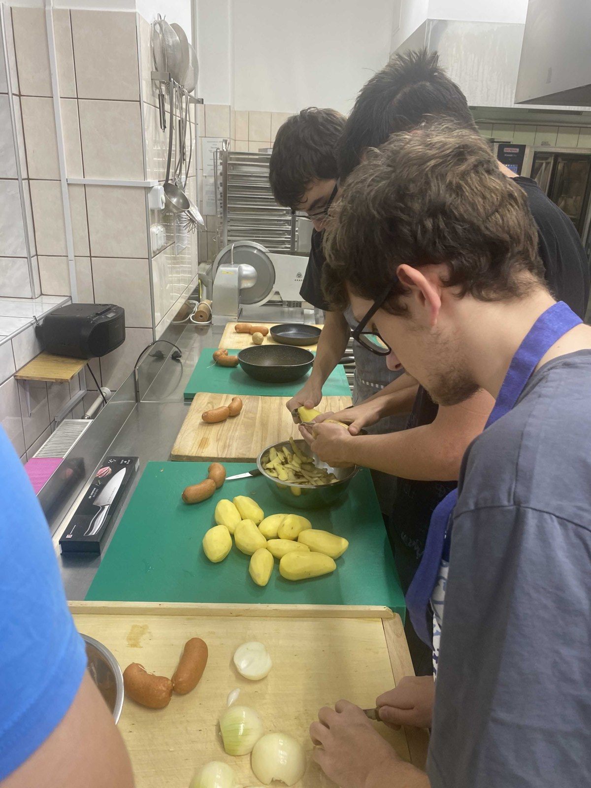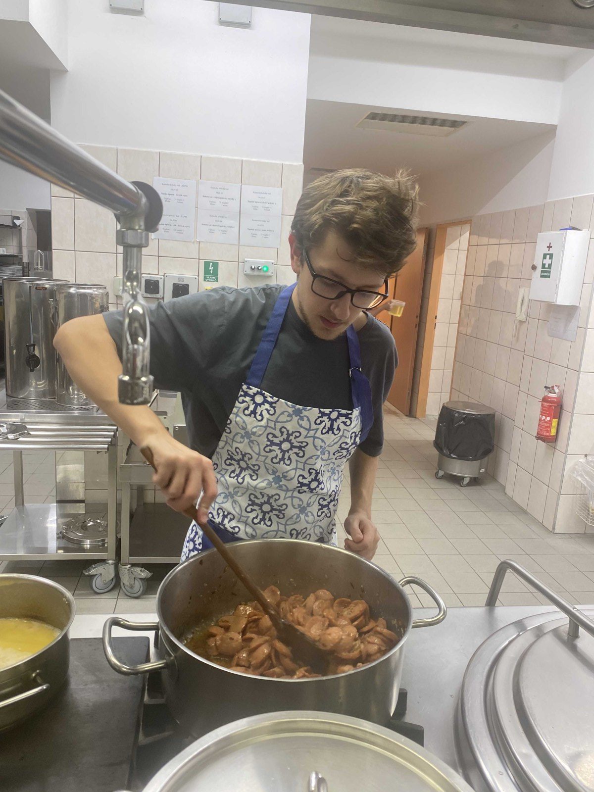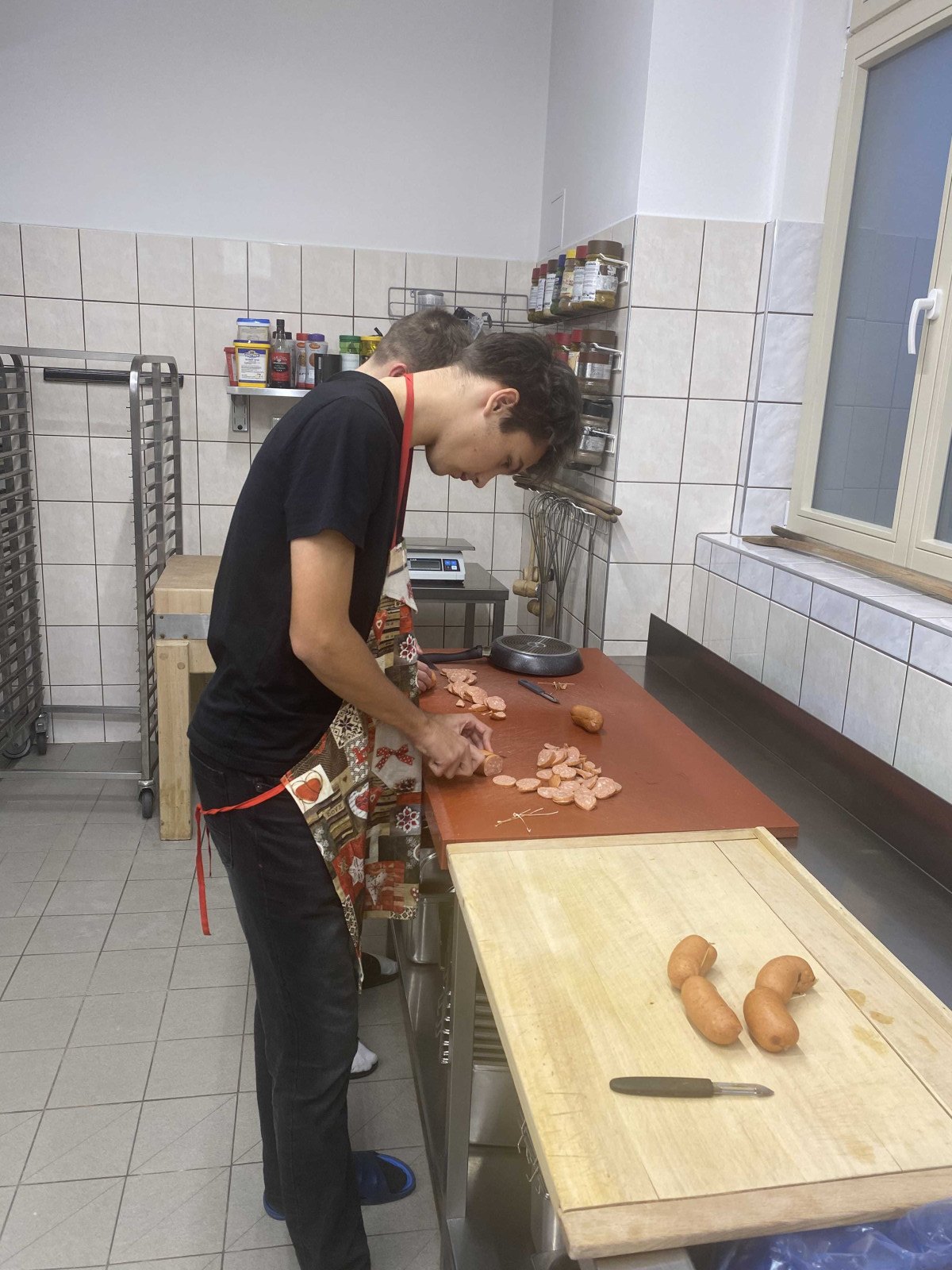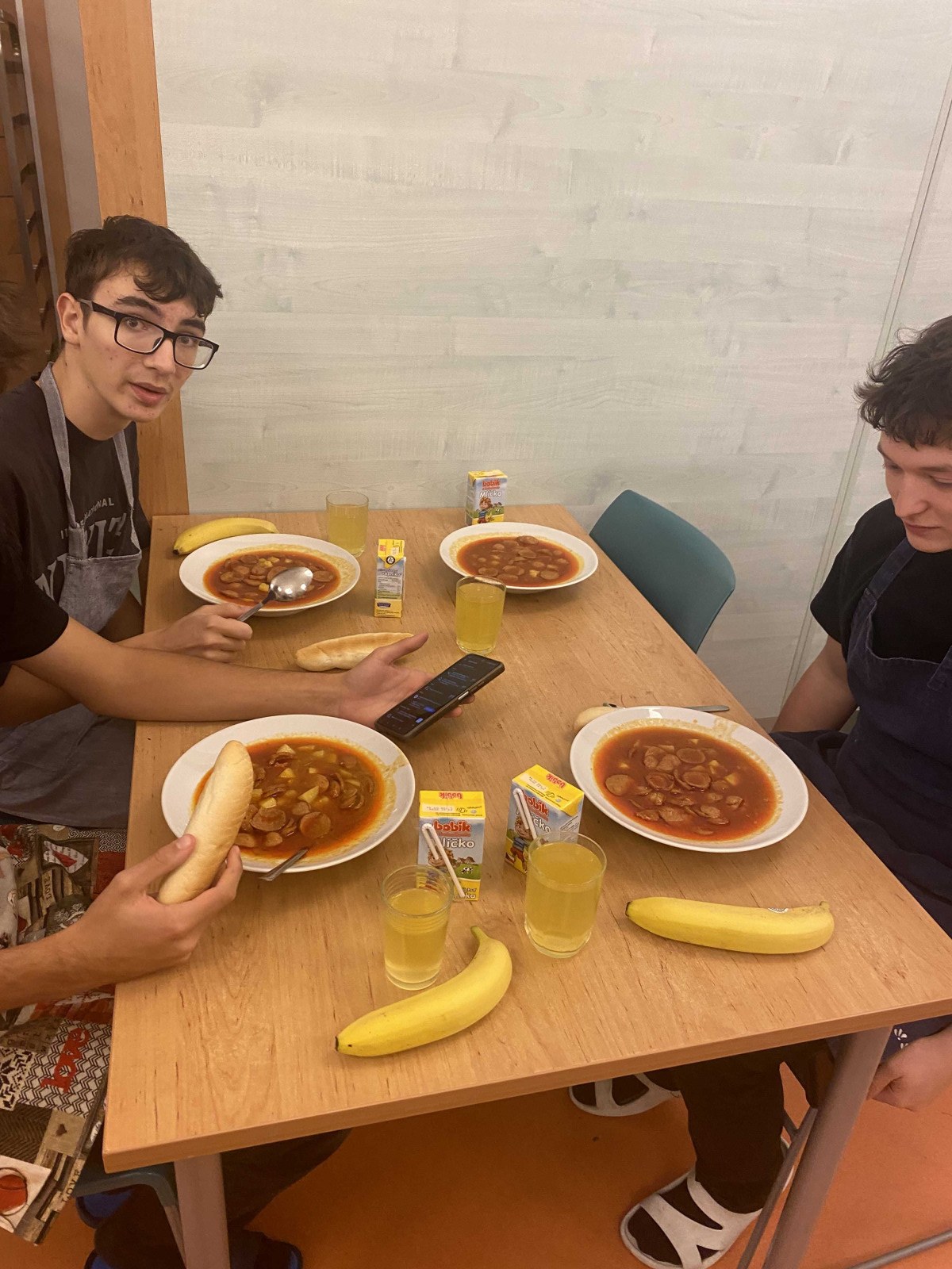 Po příchodu do školní kuchyně si kluci rozdělili role – někdo se pustil do cibule, jiný krájel buřty, další se zhostil brambor. Nože klouzaly po prkýnkách, cibule štípala do očí a celá místnost se brzy naplnila omamnou vůní smažené cibulky. K ní se přidaly opečené buřty a brambory – a rázem bylo hotovo. Na plotně bublal voňavý buřtguláš, který by si nakonec zasloužil všeobecnou pochvalu i od náročných strávníků.