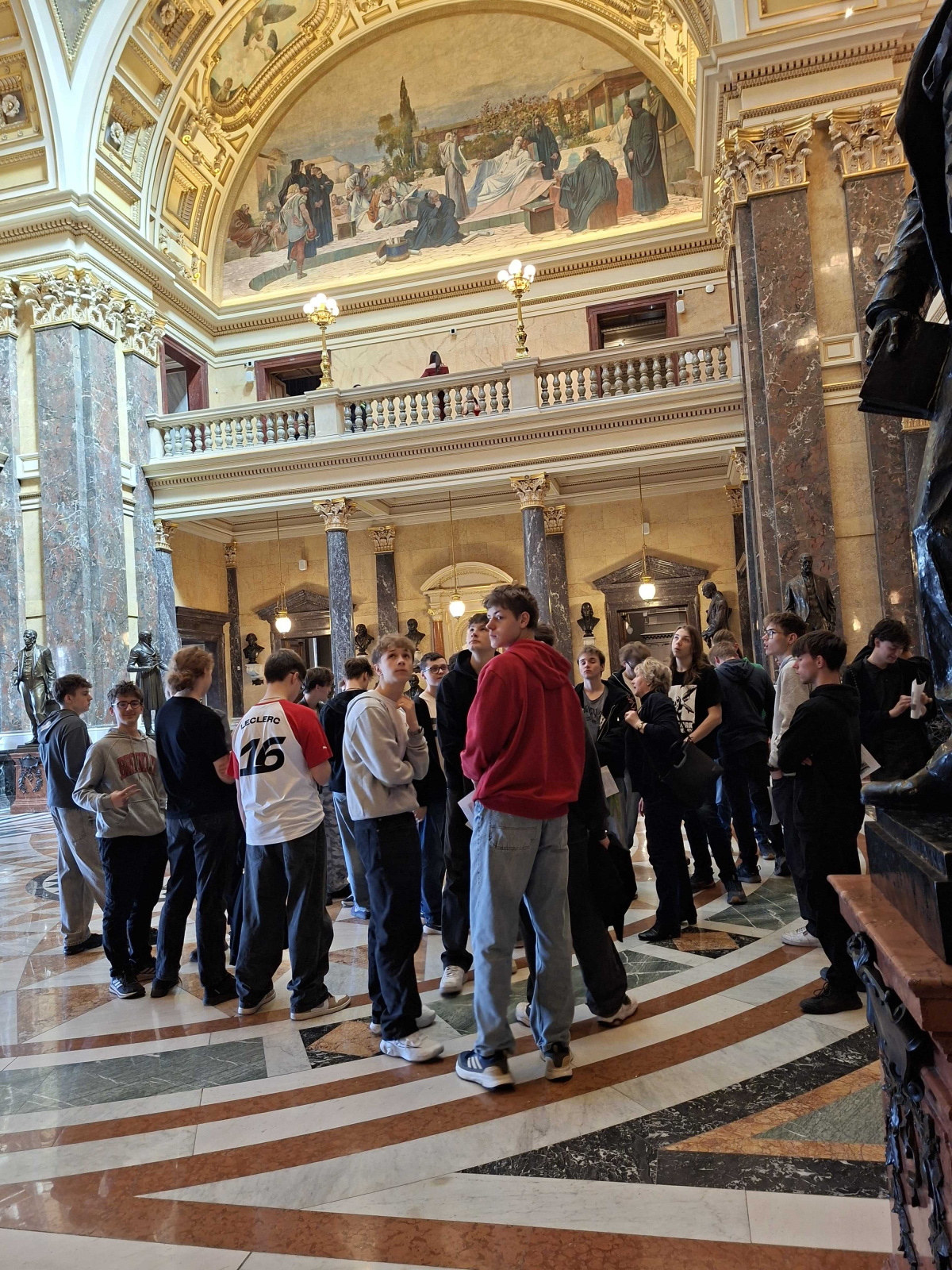 Po poledni se výprava přesunula do historické budovy muzea. Zde navštívila Pantheon, slavnostní prostor věnovaný významným osobnostem českých dějin. Závěr exkurze patřil výstupu do kupole, odkud se žákům naskytl působivý výhled na Prahu.